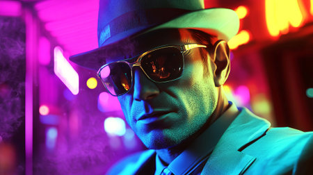 Confident man wearing sunglasses and a fedora hat stands against a colorful neon-lit background, showcasing a stylish urban atmosphere and a sense of intrigue, AI generated