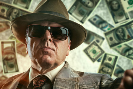 Powerful businessman wearing hat and sunglasses posing with money rain background