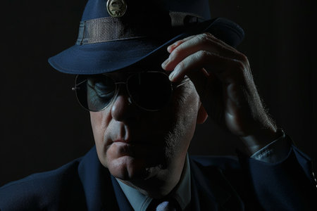 elegant mysterious businessman holding his hands together, smiling and wearing a black hat and sunglasses