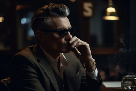 A well dressed mafia boss sits in an elegant room exuding confidence. Smoke curls from a cigarette in his mouth as he gazes intently embodying the essence of organized crime.