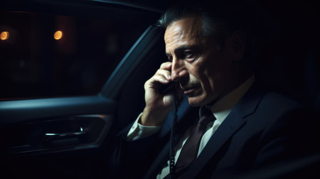 CEO Male Caucasian Mature Making phone calls and negotiating deals in a chauffeured moving car. Generative AI AIG22.