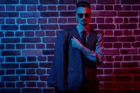 Portrait of a handsome young man in elegant suit and black sunglasses standing in red light by a brick wall. Men's fashion. Luxurious lifestyle.