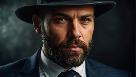 Portrait of a handsome bearded man in a suit and hat.
