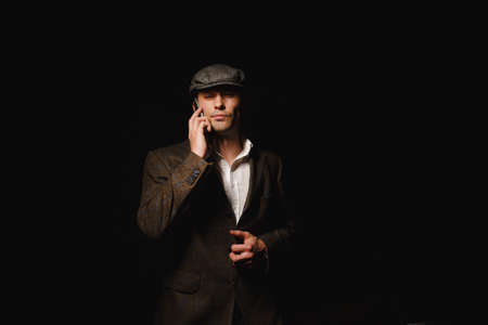 A man posing in the image of an English retro gangster of the 1920s dressed in a coat, suit and flat cap in Peaky blinders style.