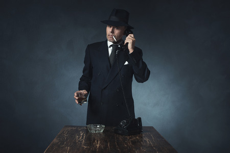 Retro 1940 businessman on the phone with cigarette in mouth. Standing behind wooden table.
