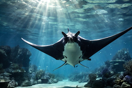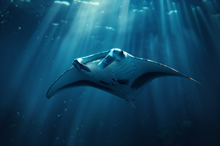 Manta ray swimming underwater in the deep blue ocean with sun rays
