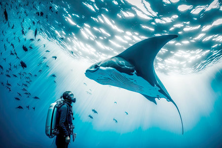 underwater photographer swimming with graceful manta ray in the open sea, created with generative ai