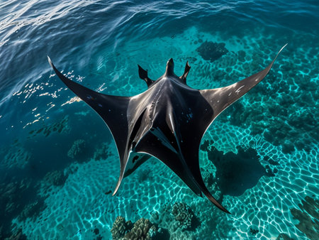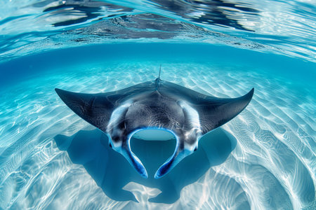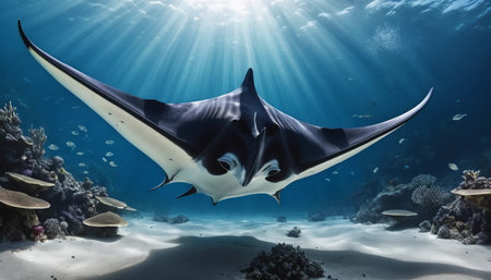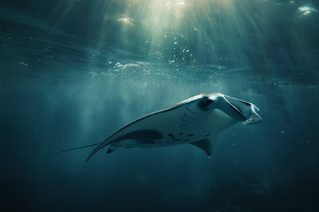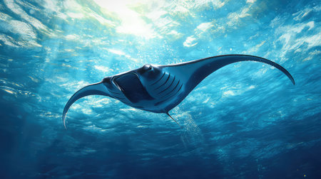 A stunning manta ray gracefully swims through the crystal-clear waters, illuminated by sun rays penetrating the surface. This serene underwater scene captures the majestic beauty of marine life, inviting viewers into the tranquil world of the ocean.