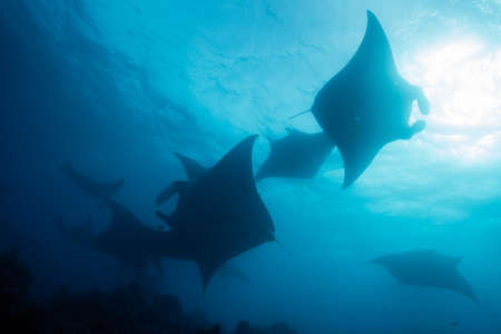 Manta Mobula (Mobulidae) cartilaginous fish swimming in tropical underwaters. Manta in underwater wild animal world. Observation of ocean wildlife. Scuba diving adventure in Ecuador coast