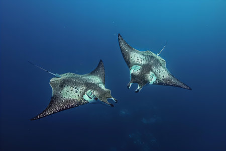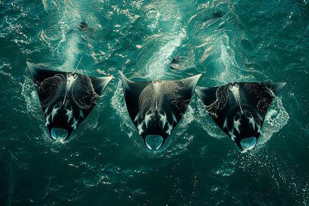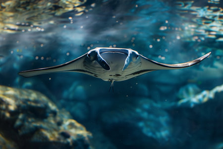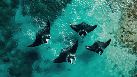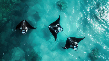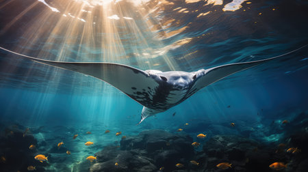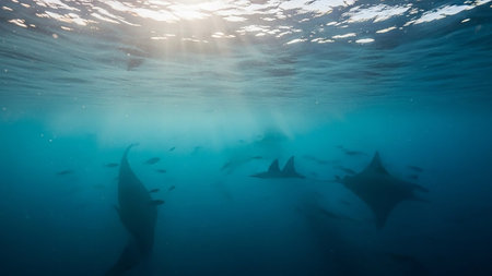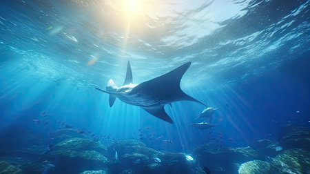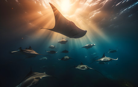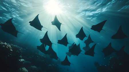 A captivating underwater scene featuring majestic rays swimming gracefully in sunlit waters, creating a serene marine ambiance.