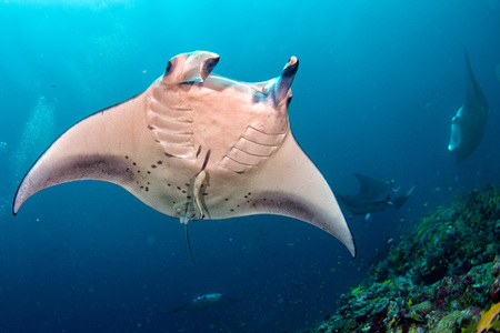 Manta ray swimming in the deep blue ocean. Underwater photography.