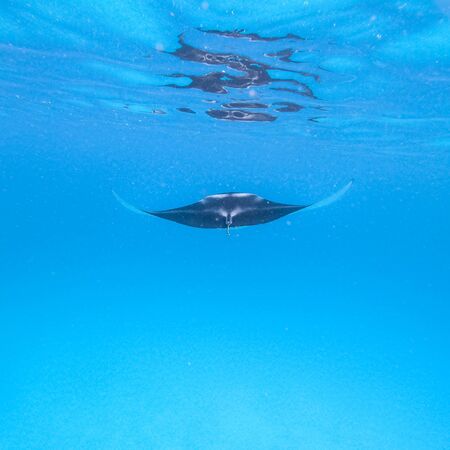Giant oceanic manta ray, Manta Birostris ,hovering in blue ocean on Maldives islands.