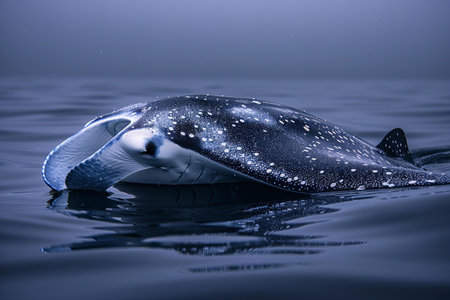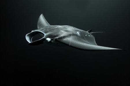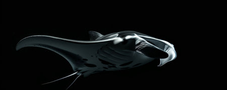 A majestic manta ray gliding effortlessly through the water on a black background. The wide, sweeping motions of its fins create a sense of grace and elegance as it moves through the dark waters.
