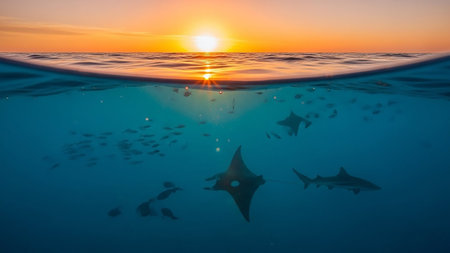 A school of fish and manta rays swim in calm ocean water at sunset. Golden sunlight reflects on the rippling surface, illuminating the marine life in vibrant hues.