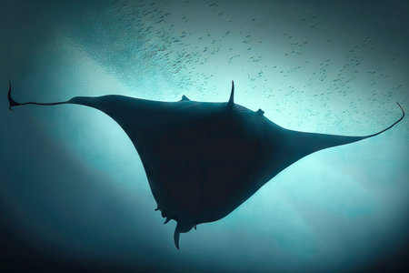 Underwater image of big ray swimming next to big school of fishes in ocean