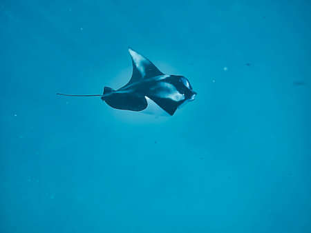 Manta ray swimming underwater in the deep blue sea. Underwater photo of a stingray.