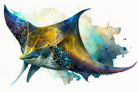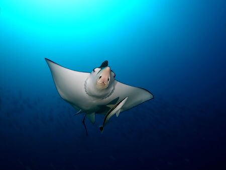 Huge majestic Oceanic Manta Ray in blue water. Abstract photo.