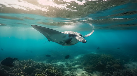 Underwater shot of a manta ray swimming in the ocean. Underwater world.