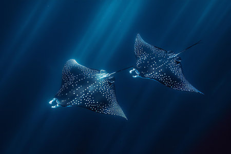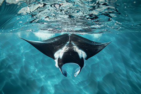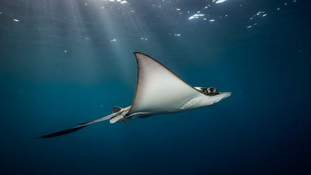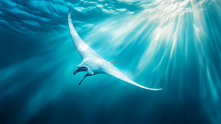 Manta ray swimming in the deep blue ocean with rays of light