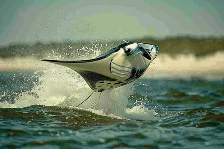 Mobula ray jumping out of the water. Pacific ocean