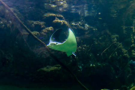 A stingray flying in the water of an aquarium. Children, artists and website designers are very fond to drawing such fish.