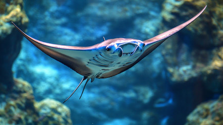 A stunning stingray swimming in an aquarium with a coral reef background