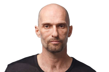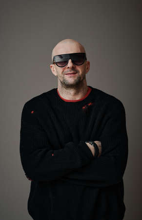 Fashion Portrait of a 40-year-old man standing over a light gray background in a black sweater. Close up. Classic style. Bald shaved head. Copy-space. Studio shot