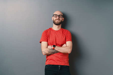Smiling bearded young man on gray background. Stylish man wearing glasses, looking at camera and smiling, holding crossed arms.
