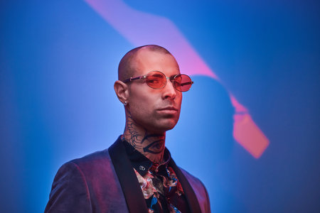 Suspicious, cool, tattooed, bald male model posing in a studio for the photoshoot wearing fashionable custom made grey tuxedo, red glasses, jewelery and rose patterned shirt, vogue style