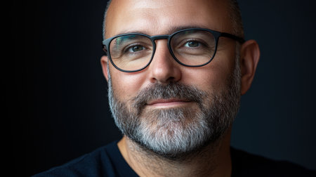 This close-up portrait captures a confident man with glasses and a beard, showcasing a warm expression and thoughtful gaze against a dark background.