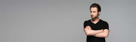 bearded man in black t-shirt posing with crossed arms isolated on gray, banner