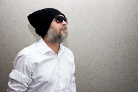Portrait of a Caucasian young bearded man with glasses and a hat looking at the left side. copyspace. The concept of choice, education and psychology.