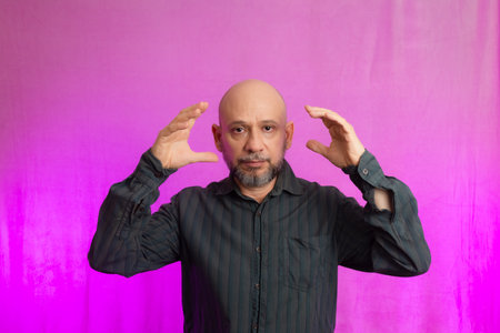Portrait of serious man, 50 years old, with beard and bald head making hand signals. Isolated on pink background.