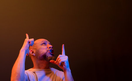 Happy bald bearded man making funny hand gestures. Concept of strength, achievement and success. Isolated on dark red background.