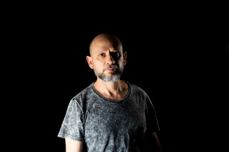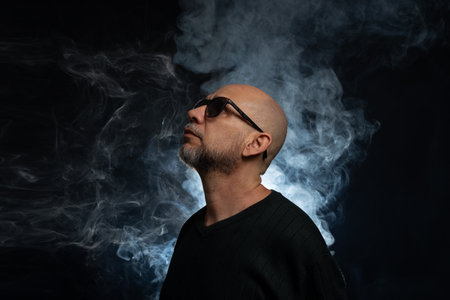 Bald middle-aged man posing for the camera. Isolated on studio artificial smoke filled background.