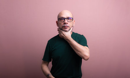 Portrait of a bald, bearded man wearing prescription glasses squeezing his neck with one hand. Isolated on salmon colored background.