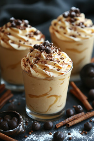 Three glasses filled with a rich coffee flavored dessert showcase layers of whipped cream and chocolate shavings. The presentation is enhanced by cinnamon sticks and chocolate balls, creating an inviting treat.