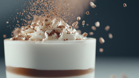 Whipped cream dessert in glass with cocoa powder dusting mid-air against dark background. Sweet indulgence, gourmet dessert concept