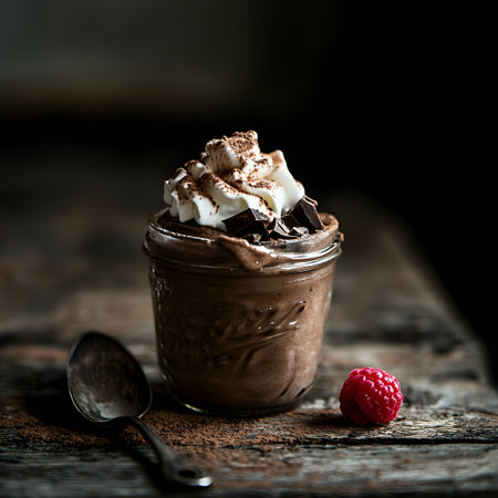 Chocolate mousse with whipped cream in a glass mason jar, raspberries and chocolate on a wooden background, dark rustic background