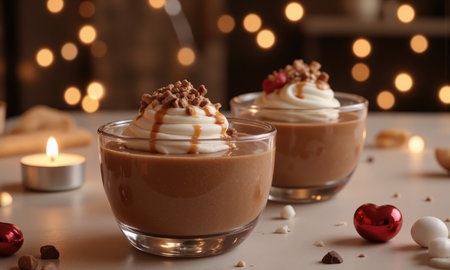 A stunning presentation of a rich chocolate dessert in a glass, topped with creamy layers, floating chocolate pieces, and a bokeh background that enhances the visual delight.