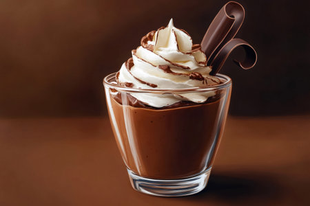 Chocolate mousse dessert with whipped cream and chocolate curls in a glass, ready for a delicious treat