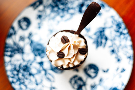 Delicious coffee dessert with chocolate spoon on a floral patterned plate. This overhead shot captures a delightful dessert featuring coffee beans and a chocolate spoon.