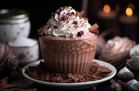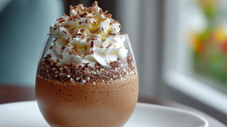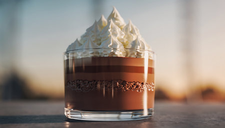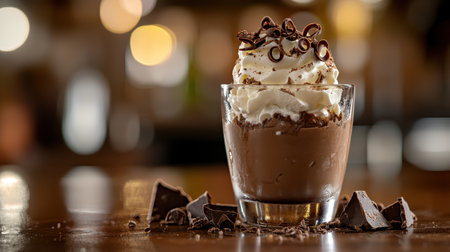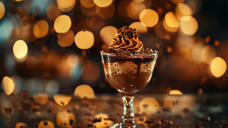 Indulge in a decadent chocolate mousse topped with whipped cream, elegantly presented in a clear glass against a glowing bokeh backdrop in a lavish setting.