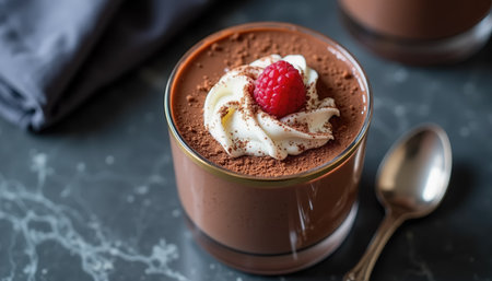 Indulgent chocolate mousse is elegantly presented in a glass, garnished with a swirl of whipped cream and a fresh raspberry, perfect for dessert lovers.
