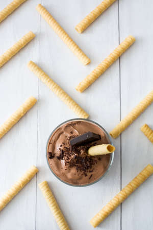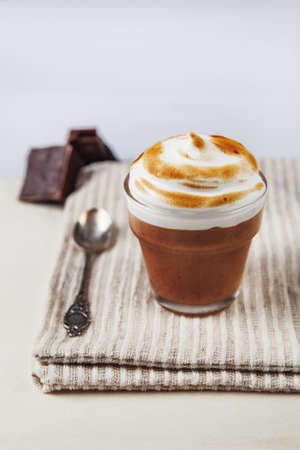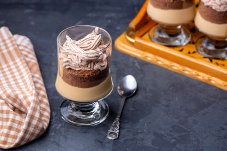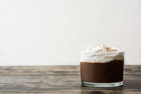Homemade delicious chocolate mousse panna cotta pudding whipped cream in a glasses.