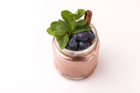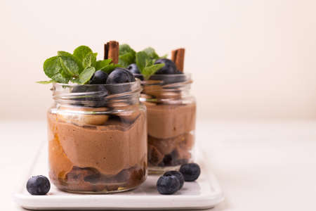 Homemade cake dessert. Chocolate mousse with blueberry, mint and cinnamon in glass jars.