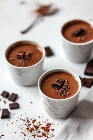 Rich chocolate mousse in bowls, accompanied by chocolate shaves and cocoa powder on a dark surface. Ideal for themes of dessert, indulgence, and chocolate treats.