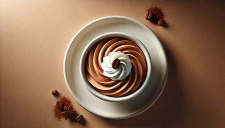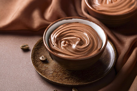 Coffee and chocolate pudding or mousse in a ceramic bowl with cinnamon and anise star, selective focus. Dark brown textured concrete background.
