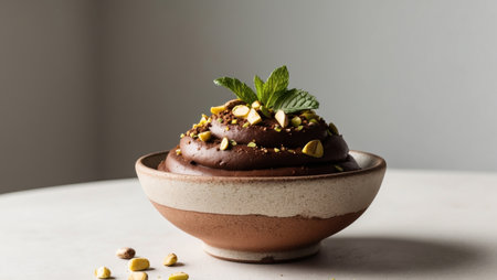 AI Generated. Rich chocolate mousse with pistachios and mint in rustic bowl