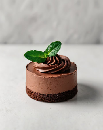 A luxurious chocolate mousse in a glass cup, garnished with a sprinkle of cocoa and a fresh mint leaf, set against a white background for a refined and appetizing look.